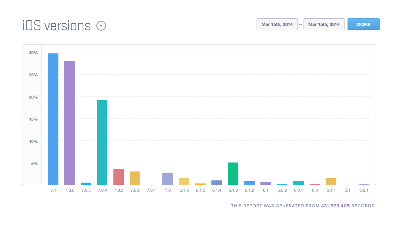 La tabla a continuación que se genera a partir de 431.579.405 registros revela que iOS 7.1 es ahora la versión de firmware más instalado. Ha superado a iOS 7.0.6 que el 28% de los usuarios todavía se están ejecutando y iOS 7.0.4 que es el 19% de los dispositivos.