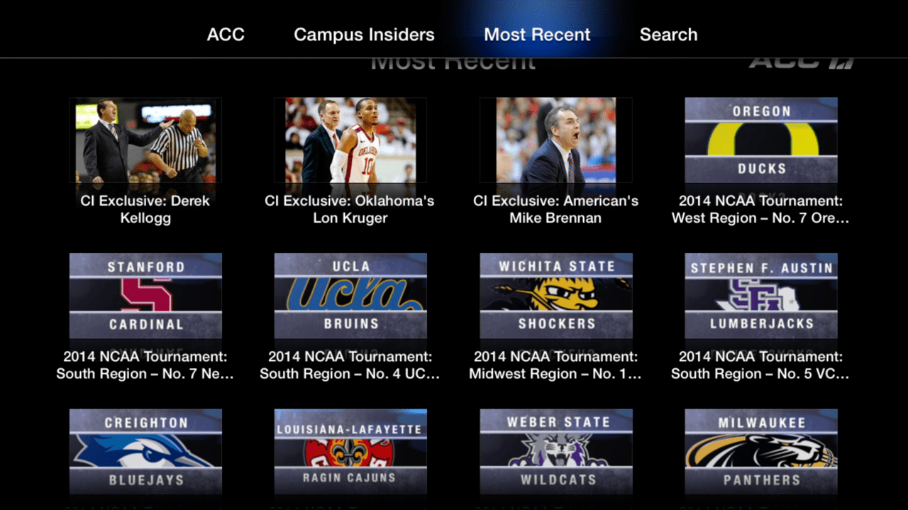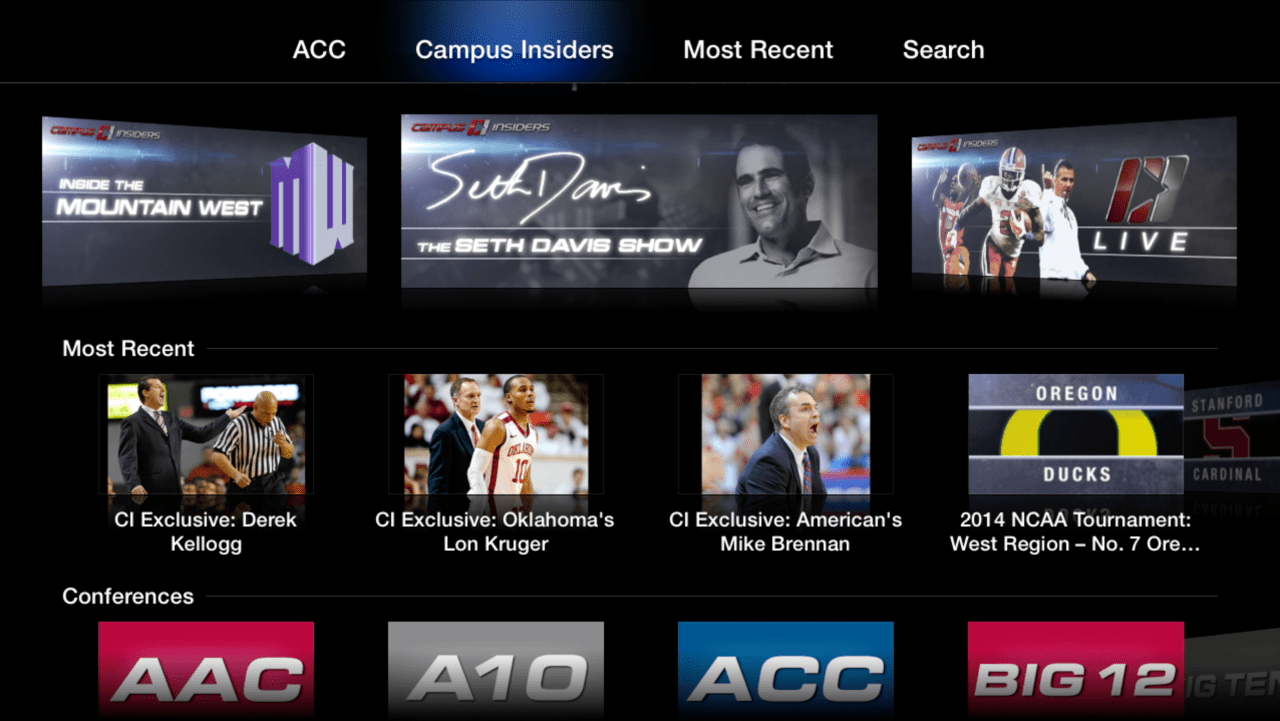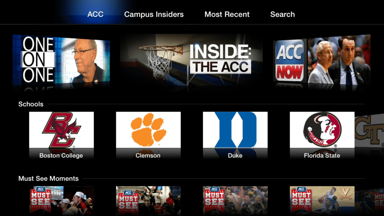 Exclusivo para el Apple TV , ACC Deportes contará con acceso a Insiders Campus , una red digital de deportes de la universidad que cubre todas las principales conferencias colegiados . Como parte de su programación de marzo de Insiders Campus cubrirán el baloncesto de la NCAA después de la temporada de principio a fin , con informes diarios de los mejores talentos de primera línea como Bonnie Bernstein , Seth Davis y más de 100 expertos de presentación de informes de los campus de todo el país . Como parte del lanzamiento , los de adentro del plantel publicar más de 70 videos de hoy tales como avances del equipo de los 68 equipos seleccionados para el torneo.