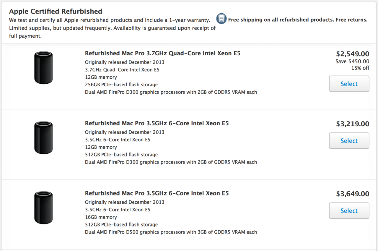 Apple ha comenzado a vender renovados Mac Pro en su tienda en línea. Los clientes pueden comprar el equipo de gran alcance para un descuento del 15% en su precio de venta normal. Hay varias configuraciones disponibles el más barato de ser un 3.7GHz Quad-Core Intel Xeon E5 con memoria de 12 GB, 256 GB de almacenamiento flash basada en PCIe, y procesadores gráficos AMD FirePro D300 Dual con 2 GB de GDDR5 VRAM cada uno por $ 2,549.00.
