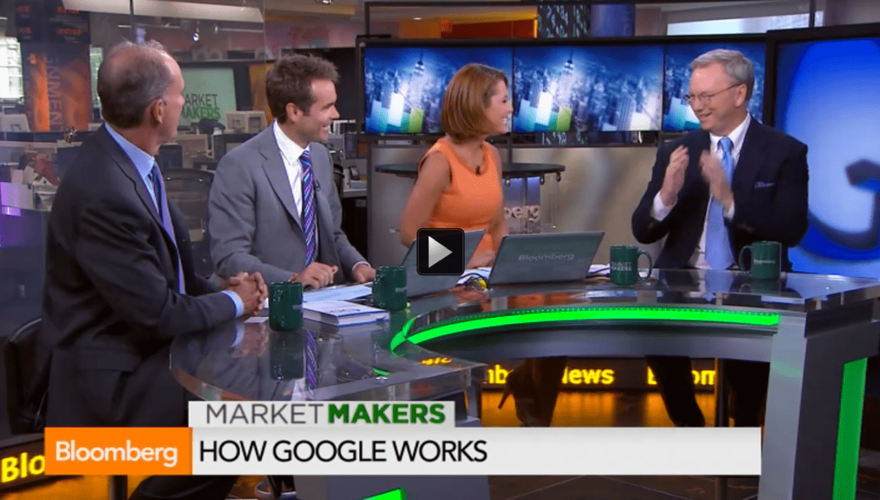 Schmidt y el ex Vicepresidente Jonathan Rosenberg habló sobre su libro "How Google Works," la industria móvil y la competencia de Google con Apple en el programa "Creadores de Mercado" de Bloomberg Television con Stephanie Rühle y Erik Schatzker.
