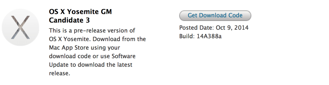La tercera generación GM se puede descargar como una actualización de diferencias pequeñas, que van desde 40 MB a 100 MB, ahora mismo, desde la Mac App Store. Si la actualización no aparece, actualice la ficha Actualizaciones pulsando Comando + R para hacer que se muestre. Los desarrolladores también pueden optar por descargar el instalador de Yosemite desde el sitio web Centro de desarrolladores de Mac a través del proceso de código de canje si no lo han hecho todavía.
