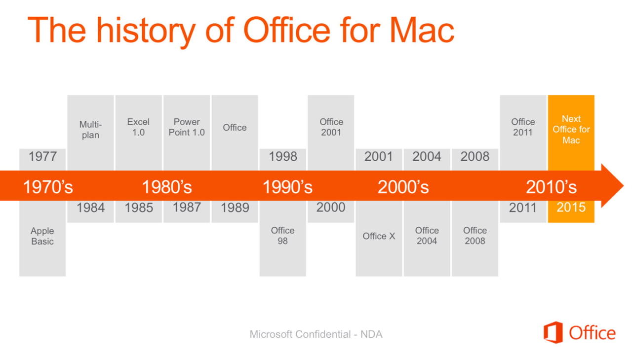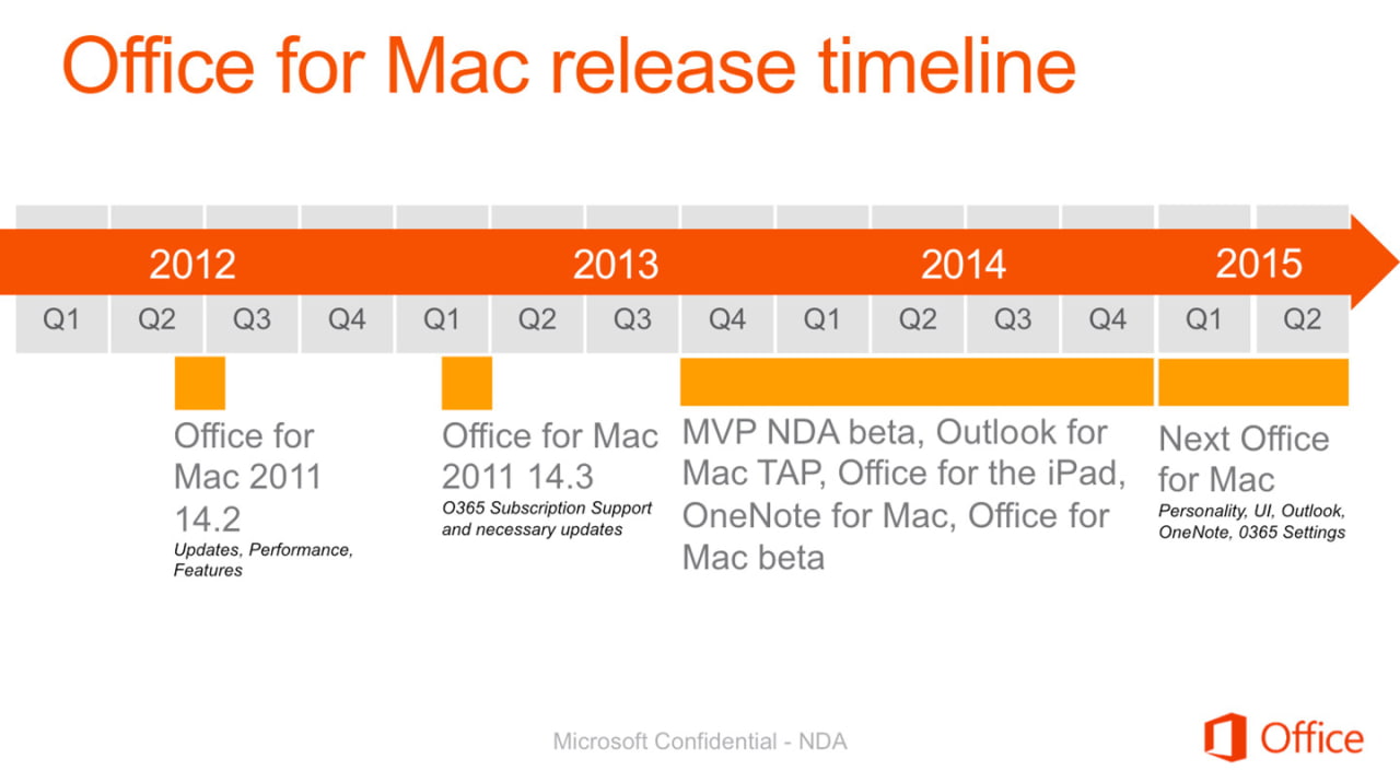 De acuerdo con las capturas de pantalla, Microsoft está apuntando a una fecha de lanzamiento a principios de 2015. Ellos están invirtiendo en cuatro nuevas áreas clave: Modernización, Servicios & Nube conectados, Enterprise listo Outlook y OneNote llega a Mac.