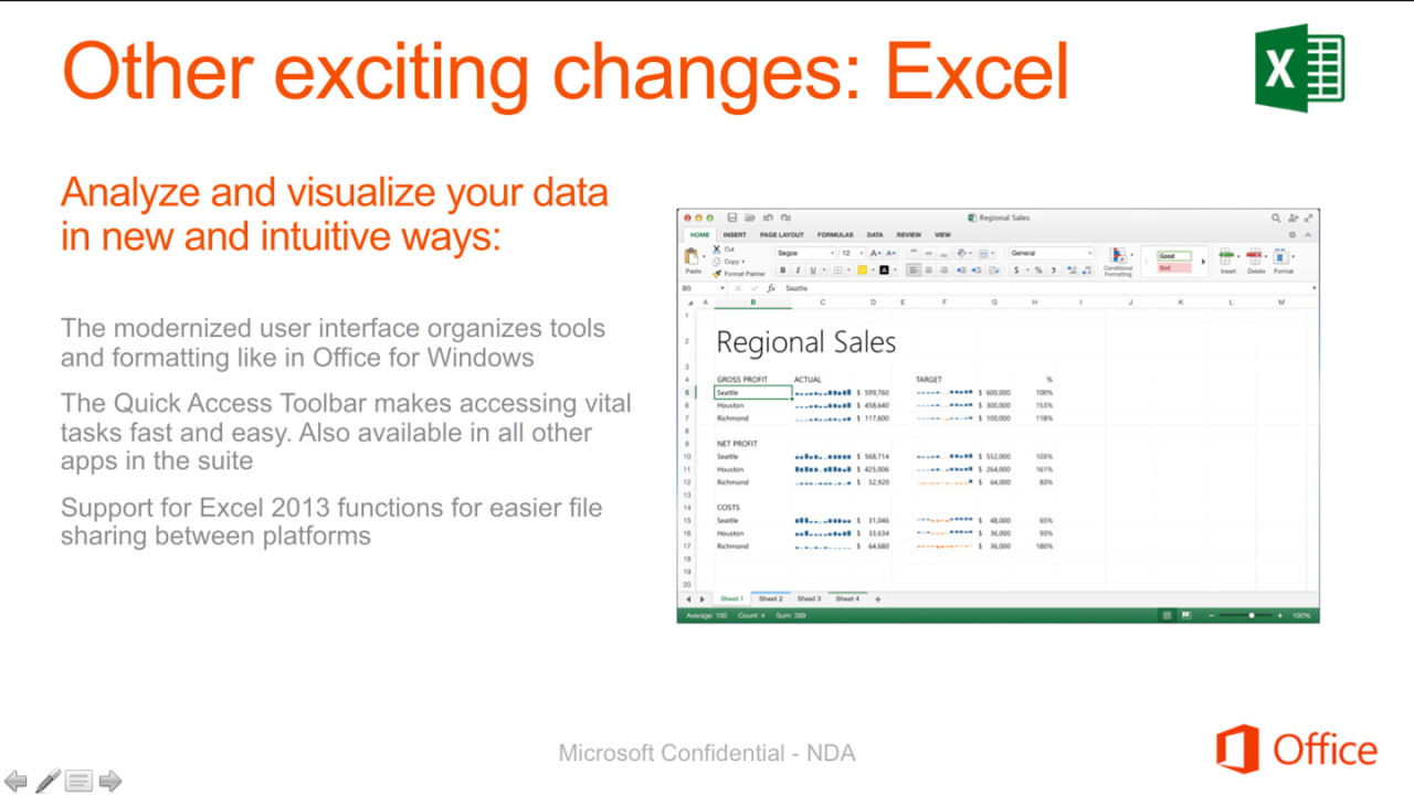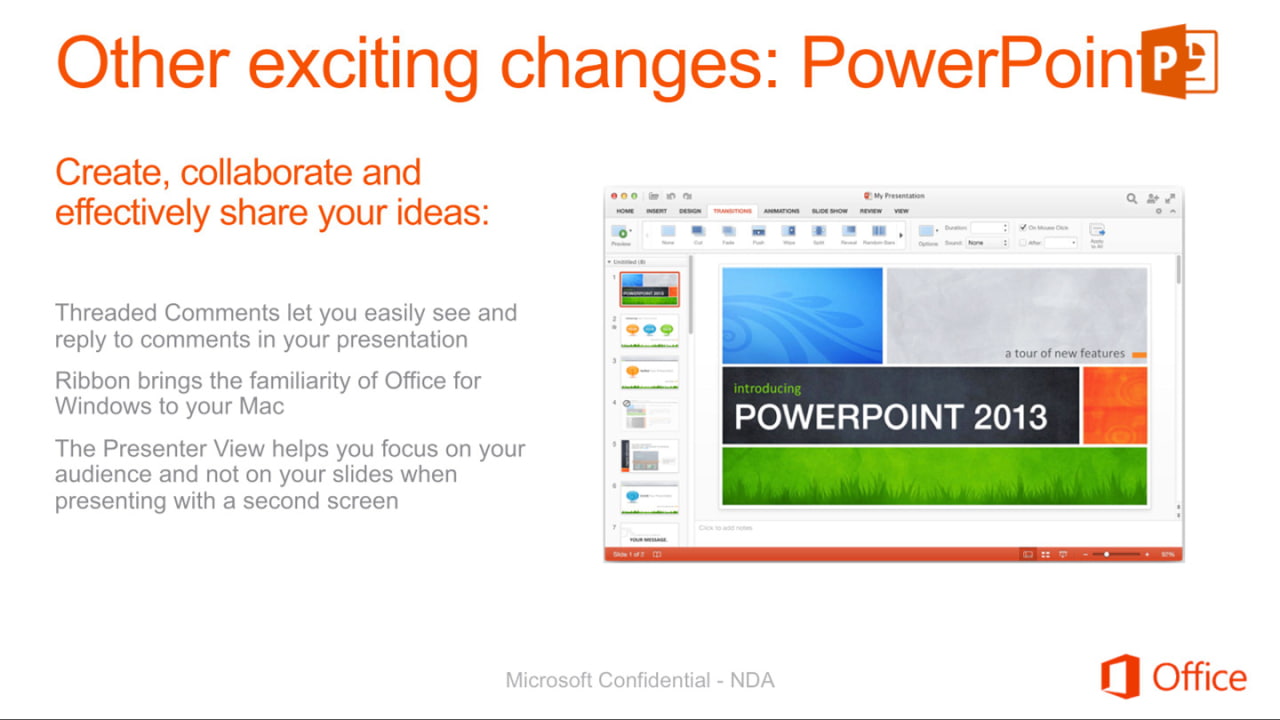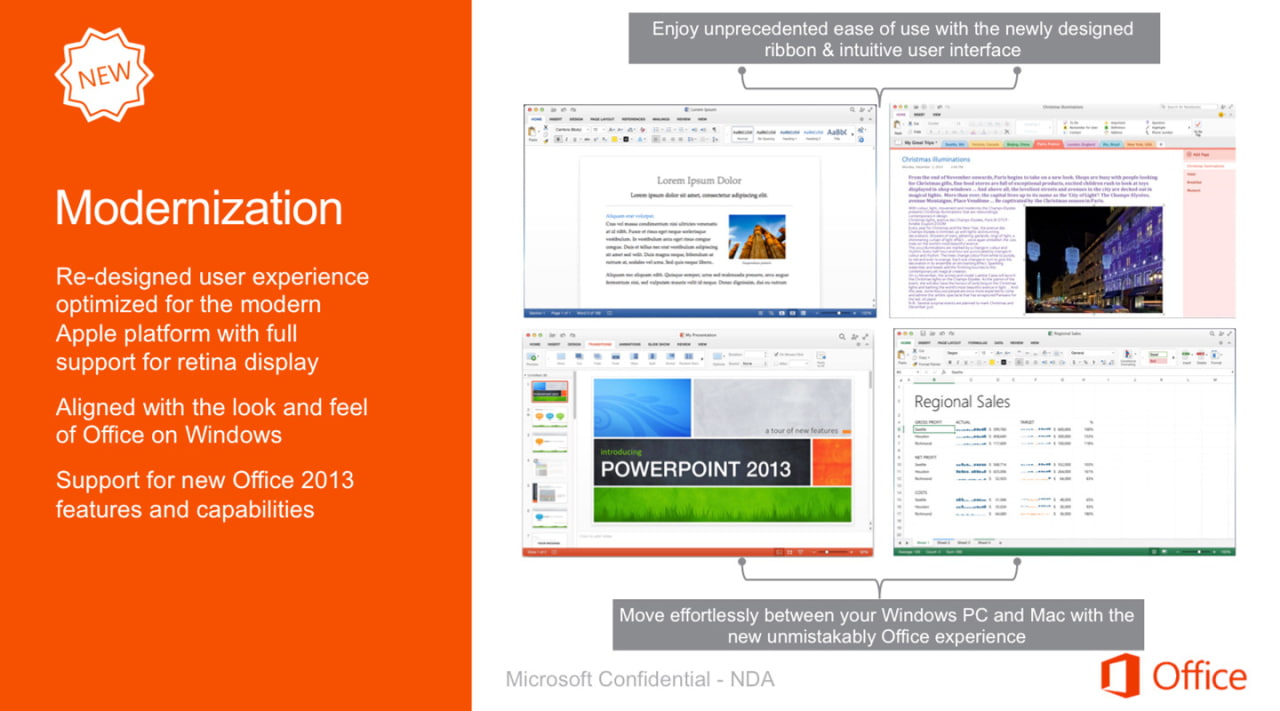 Re-diseñado la experiencia de usuario optimizada para la plataforma de Apple moderno con soporte completo para la pantalla retina. Alineado con la apariencia de Office en Windows. Apoyo a la nueva oficina de 2.013 funciones y capacidades.
