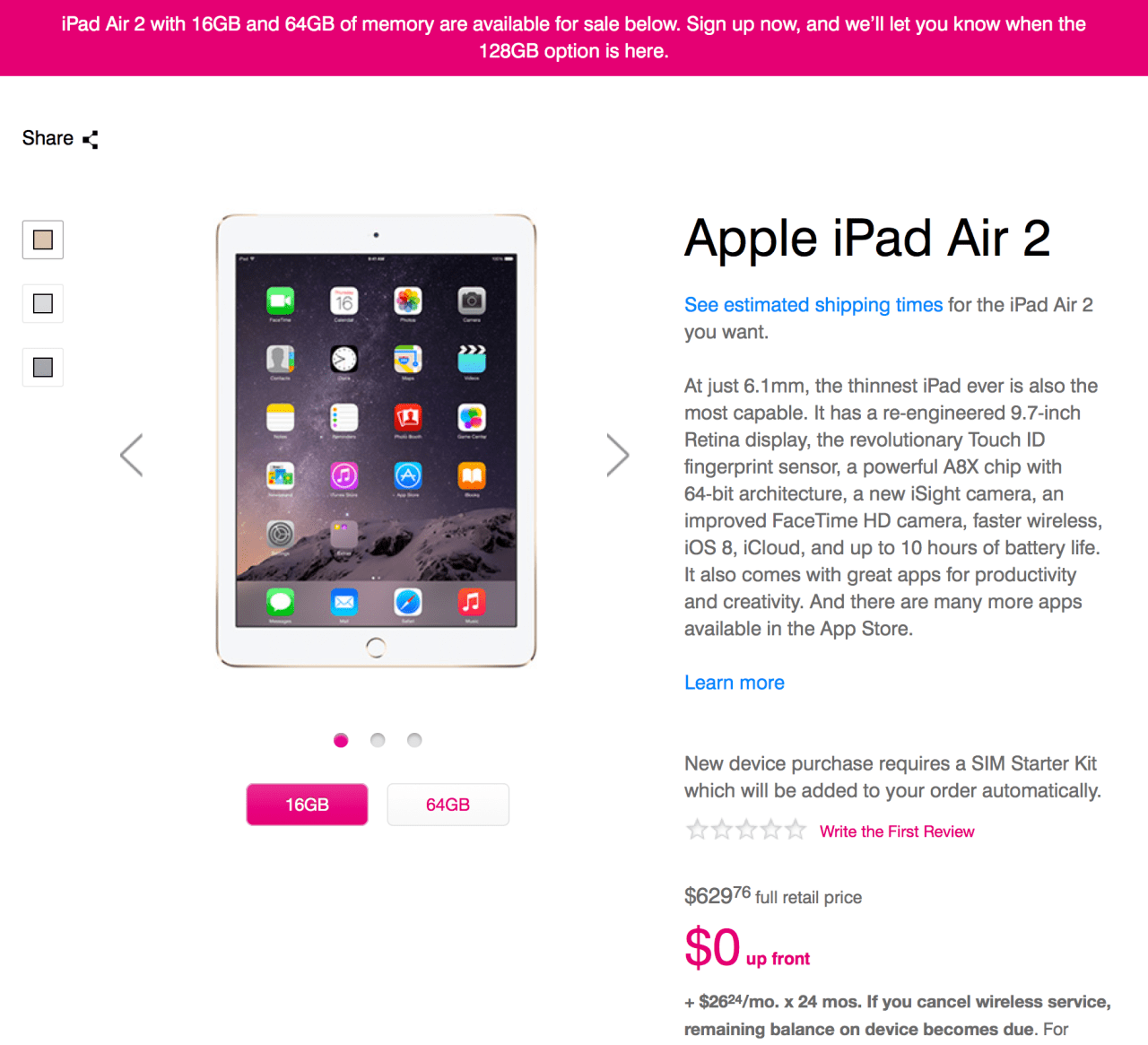 A partir de hoy, los clientes de Una portadoras ahora pueden comprar el iPad Aire 2 con Wi-Fi + celular y mini iPad 3 con Wi-Fi + celular en las tiendas de T-Mobile y en línea participantes.