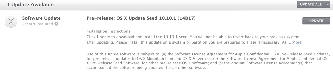 Apple ha sembrado la primera compilación de OS X Yosemite 10.10.1 a los desarrolladores para su descarga. El número de compilación de esta semilla es 14B17.