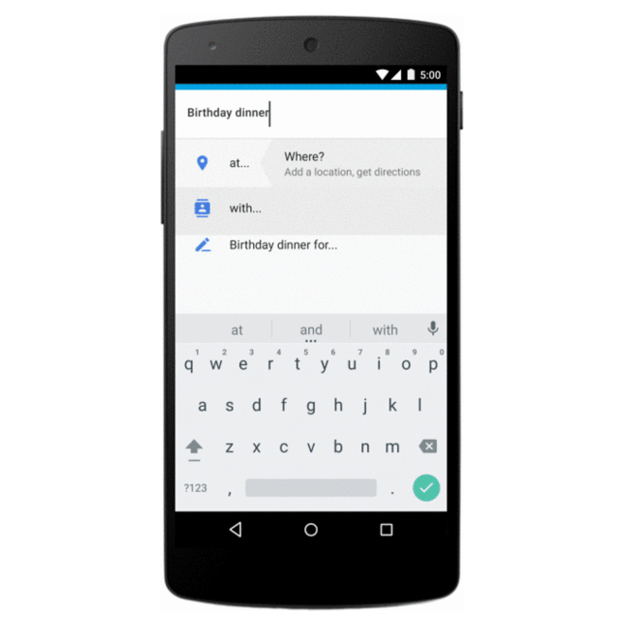 Por supuesto, no toda la información de eventos llega a su bandeja de entrada. A menudo se tiene que juntar los números de teléfono, direcciones y asistentes de las porciones de diversas fuentes, a continuación, añadir a su calendario de forma manual. Con Asistencias, calendario se puede sugerir títulos, personas y lugares a medida que escribe, así como adaptarse a sus preferencias con el tiempo. Por ejemplo, si usted a menudo de ir corriendo con Pedro en el Parque Central, El calendario se puede sugerir rápidamente todo ese evento cuando se escribe "carrera".