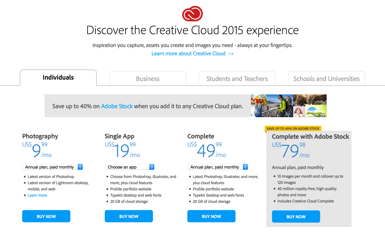 Actualizaciones de hoy a CC de escritorio y aplicaciones móviles están inmediatamente disponibles para su descarga por los miembros de Creative Cloud como parte de su membresía sin costo adicional. Planes de membresía están disponibles para las personas, los estudiantes, los equipos, las instituciones educativas, agencias gubernamentales y empresas. Al añadir Adobe Stock a cualquier plan de membresía Creative Cloud anuales pagadas, los creativos pueden ahorrar hasta un 40 por ciento más que la compra de contenido stock por separado. Para detalles de precios, visite: https://creative.adobe.com/plans.