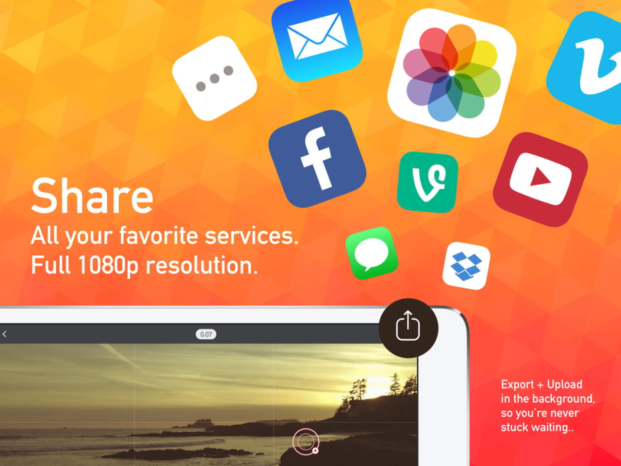 Con Vee puede compartir con todos sus servicios favoritos. Hacemos algo realmente especial aquí también. En lugar de tener que esperar mientras Vee exporta el vídeo, puede cambiar a otra aplicación y Vee seguirás en el fondo. Luego, cuando se hace, se iniciará la carga en el fondo también.