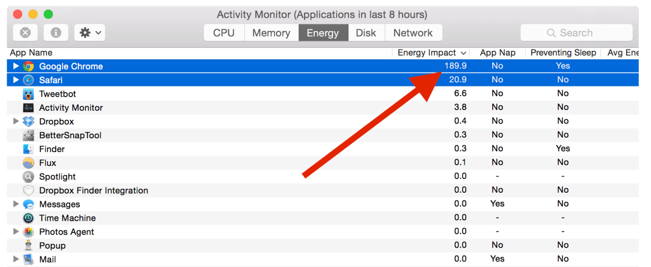 Ahora: ~ 59% de reducción en los despidos temporizador y ~ 70% de reducción en el uso de la CPU. Chrome está incurriendo ~ 316 activaciones más de 30 años y 0.2% de uso de CPU, a la par con Safari en 312 estelas, y 0,1% de uso de CPU.
