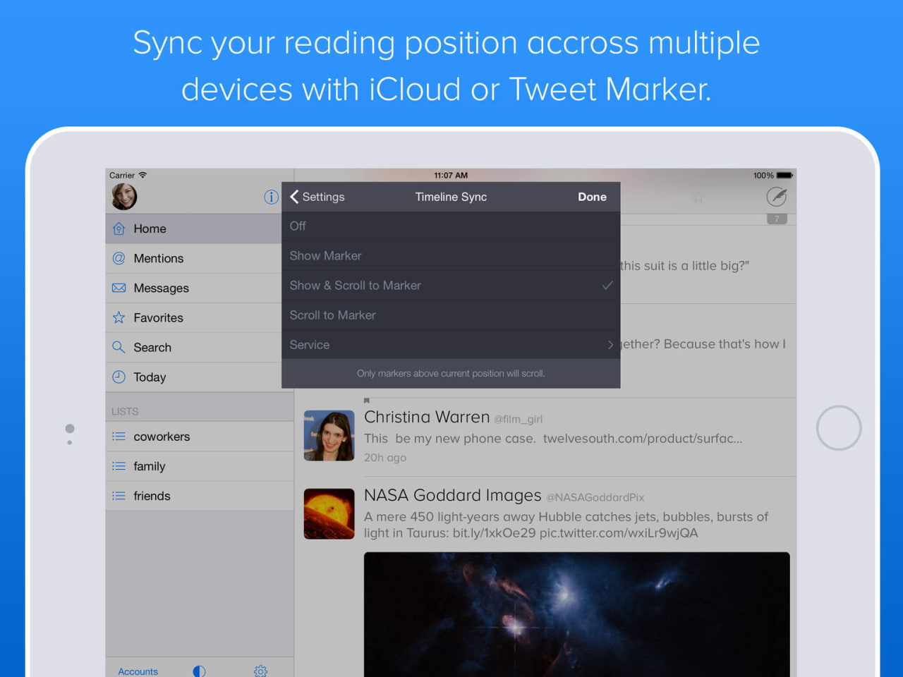 Explorar tanto menciones y mensajes directos directamente desde su línea de tiempo en casa. Personalizar fuentes, tamaños avatar, miniaturas de las imágenes y más a través del panel temático. Responder rápidamente a los tweets, cambiar cuentas o hilos vista de conversación con un mínimo de esfuerzo mediante gestos. Apoyo de los medios Rich incluyendo varias imágenes y Twitter GIFs animados. Apoyo VoiceOver robusta significa.