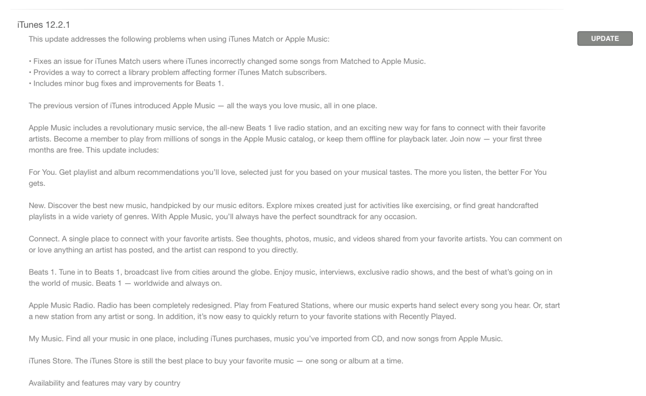 Apple ha publicado una actualización de corrección de errores pequeños para iTunes, versionado como iTunes 12.2.1. La liberación tiene como objetivo abordar temas con Apple Música, iTunes Match, y Beats 1 radio, y se recomienda para todos los usuarios de iTunes 12.2 que han experimentado problemas con cualquiera de las funciones o servicios mencionados.