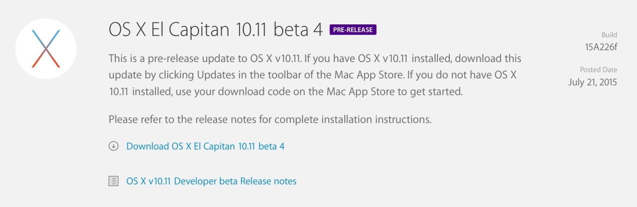 Apple ha lanzado OS X El Capitán 10.11 beta 4 para los desarrolladores para la prueba. El número de compilación de la nueva beta es 15A226f.