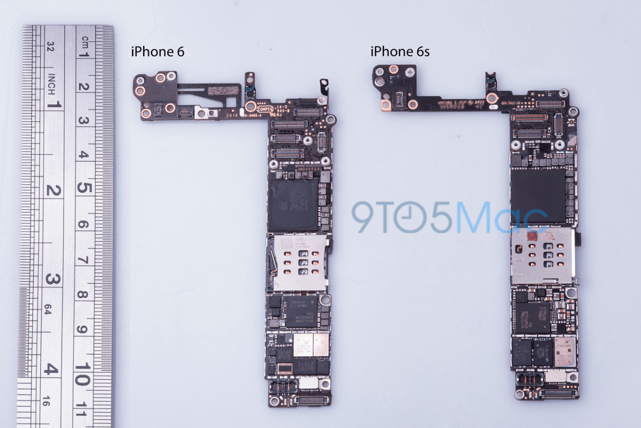 Una sección de la junta que tenía anteriormente en más de 10 componentes se ha reducido a 3 fichas principales, cortando al mismo tiempo el número de piezas y el aumento de la eficiencia energética de los que quedan. Otras fichas necesarias y restantes, tales como la memoria flash y la CPU, en particular se benefician de procesos de fabricación más pequeños que permiten a los 6S iPhone para ofrecer la misma funcionalidad o más rápido con menos partes más pequeñas, hambrientos de poder.