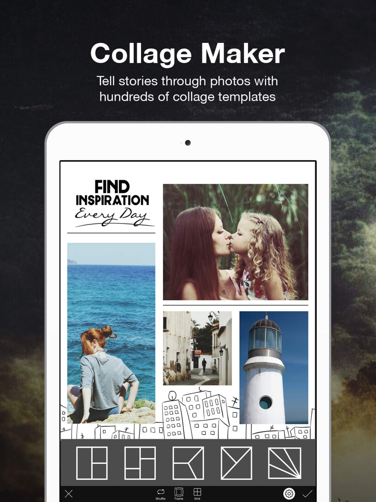 ● Un fabricante de collage para crear collages de fotos en rejillas, marcos de collage, de forma libre, o con fotos en el fondo. Es fácil de hacer collages y compartir con Facebook e Instagram. Con PicsArt es fácil para crear la familia y de la boda collages, tarjetas de felicitación, tutoriales rápidos paso a paso y más.