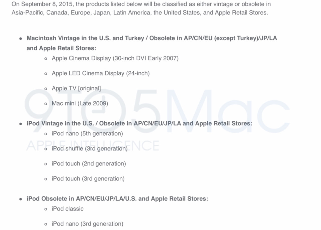 La televisión original de Apple, Apple LED Cinema Display (24 pulgadas), Apple Cinema Display (30 pulgadas DVI A principios de 2007), Mac mini (finales de 2009), iPod nano (5ª), el iPod shuffle (tercera), iPod touch (segunda y tercero), clásico del iPad, y el iPod nano (tercera) todos se clasifican como de época o obsoleta en Asia-Pacífico, Canadá, Europa, Japón, América Latina, Estados Unidos, y Apple Retail Stores.