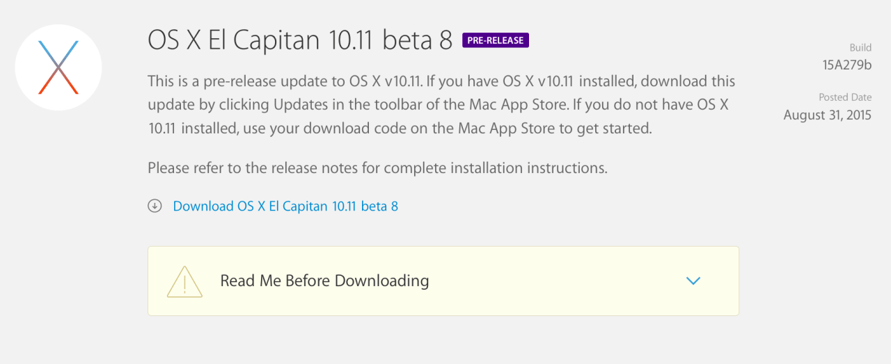 Apple ha lanzado dos nuevos beta obra de OS X El Capitán, Desarrollador Beta 8 para los inscritos en el programa oficial para desarrolladores de Mac y Public Beta 6 para usuarios de Mac en el programa de pruebas beta pública. La nueva construcción llegan como 15A279b y 15A279d, respectivamente.