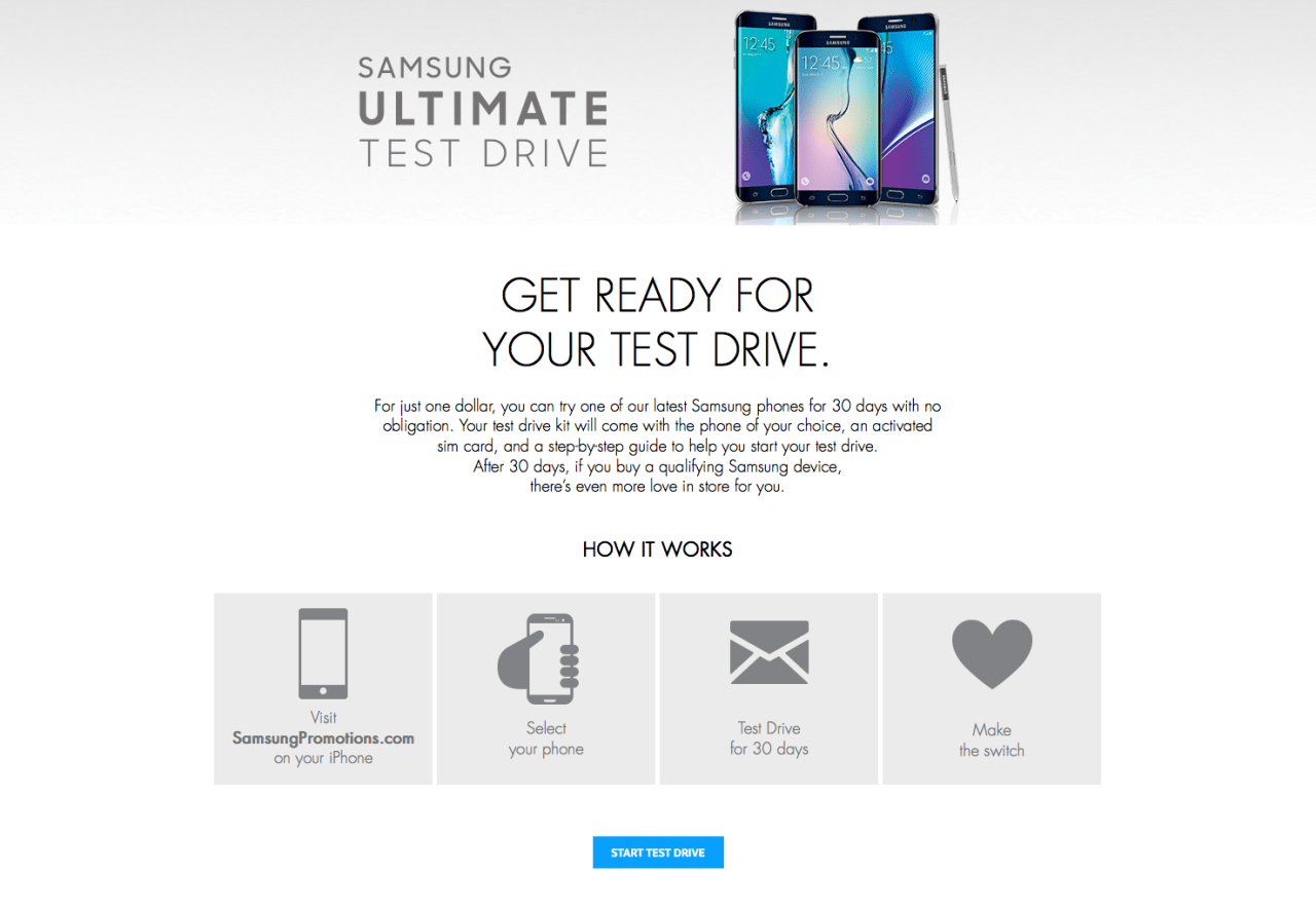 Test Drive uno de nuestros últimos smartphones Galaxy en su proveedor actual durante 30 días sin ningún compromiso por sólo $ 1. Después de eso, sólo tiene que devolverlo. O bien, si el teléfono se siente bien para ti, seguir adelante y mejorar.