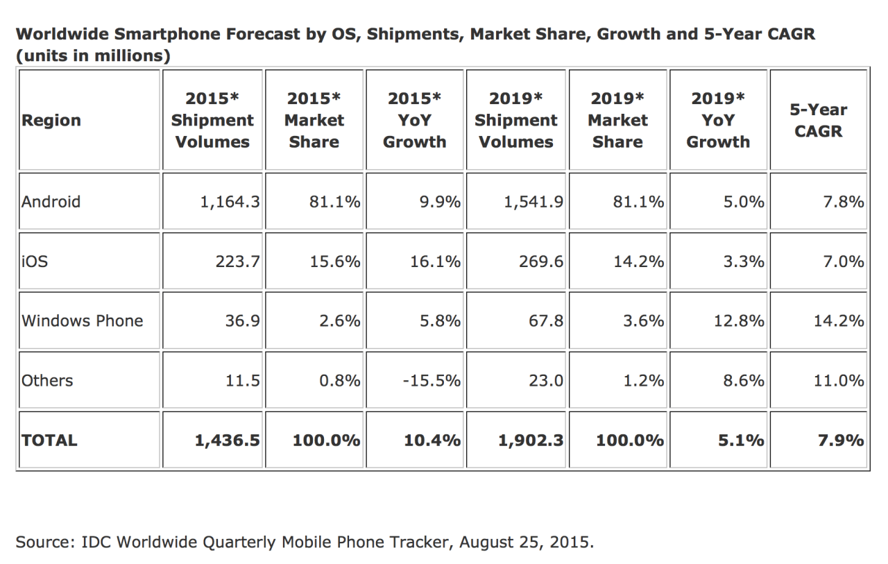 A pesar del éxito continuo de Apple con sus variantes del iPhone, no se espera que la historia de los sistemas operativos para cambiar todo el pronóstico, con Android 81% de participación en 2015 llevando adelante hasta 2019. Los mercados con la mayor oportunidad de crecimiento son extremadamente sensibles a los precios, que IDC cree que no va a cambiar, y esta es la razón principal de Apple se enfrentan al reto de ganar cuota de Android en todo el pronóstico. Incluso si Apple fuera a introducir otro iPhone de bajo costo (por ejemplo, la versión "C"), IDC cree que el precio tendrá que luchar para competir con los fabricantes de equipos Android que se centran en las carteras dirigidas a un precio de $ 200 y menos. Esto no quiere decir que el éxito de Apple con el iPhone no va a continuar, e IDC cree que sus esfuerzos para mantener los márgenes significativamente más altos en comparación con sus competidores son mucho más valiosos que persiguiendo acción. A nivel mundial se espera que los envíos de Android para crecer a partir de 1060 millones en 2014 hasta 1.54 mil millones en 2019, mientras que los envíos de iOS crecerá de 192,7 millones en 2014 hasta 269600000 en 2019. vista de IDC que Microsoft / Windows Phone seguirá siendo un retador marginal en el mejor no tiene cambiado.