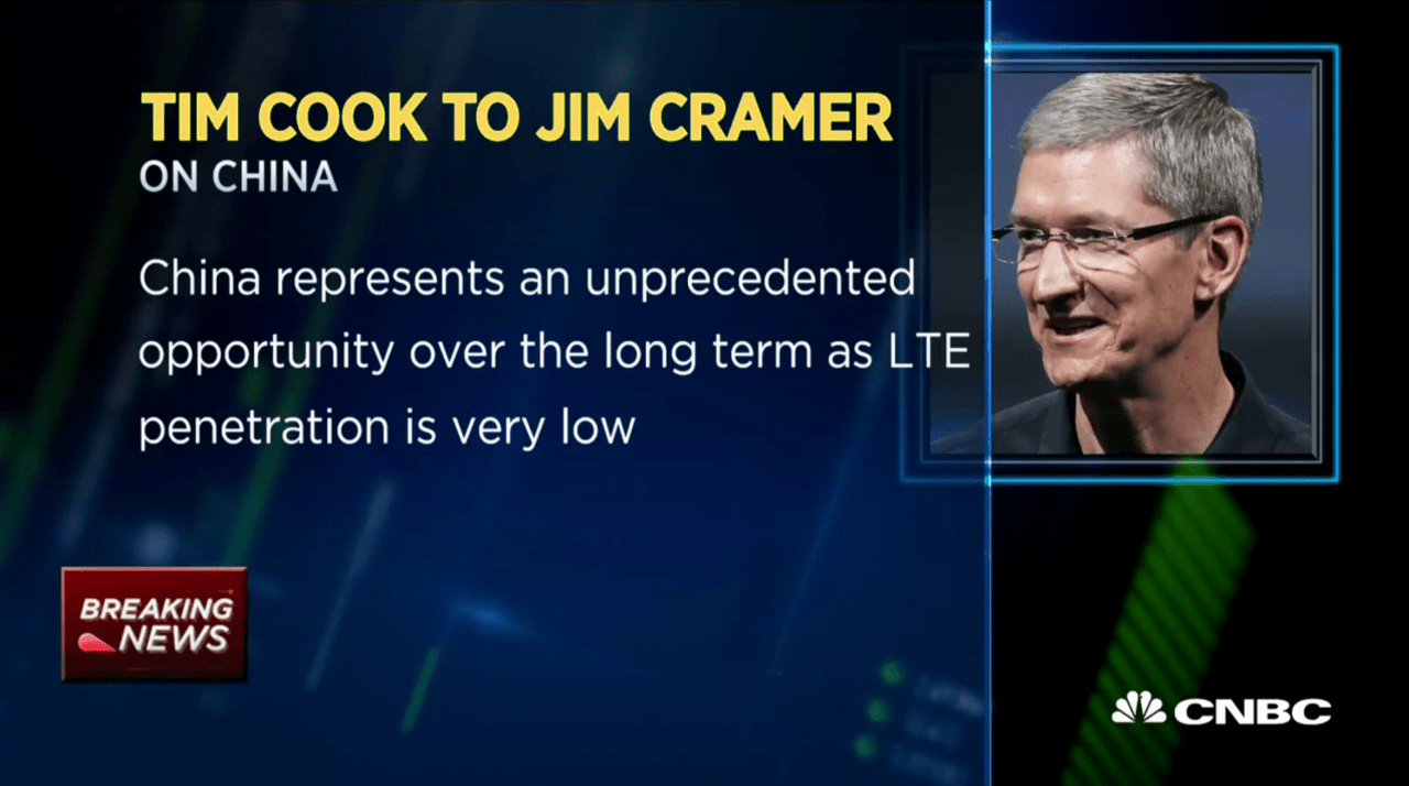 CEO de Apple, Tim Cook dice a Mad Money Jim Cramer que la compañía está experimentando un fuerte crecimiento en China, como gotas AAPL debajo de $ 100 por primera vez desde octubre de 2014.