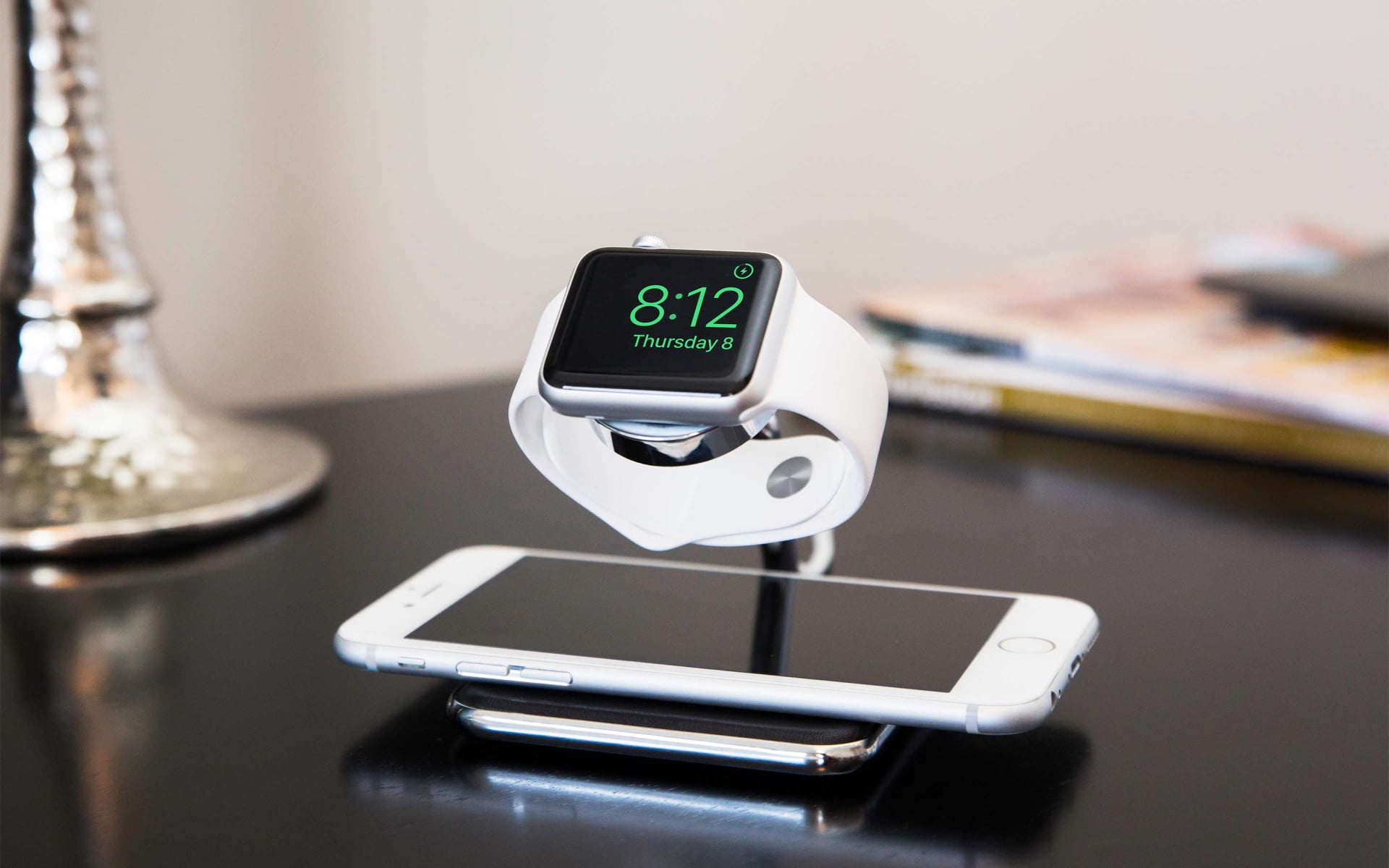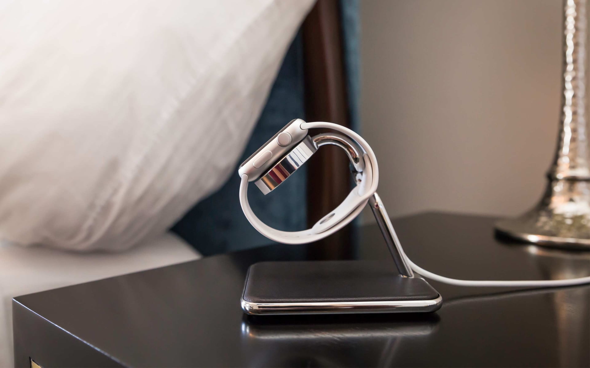 Cargue su reloj en Forté utilizando su disco de carga de Apple. Inserte el disco de carga en la parte superior del soporte de cromo y pase el cable por la parte posterior del brazo. Esta integración simple cable hace que sea fácil y conveniente para quitar el cable cuando se viaja. Un anillo cromado policarbonato protege el disco de carga en sí y efectivamente protege al cuerpo de Apple Watch de cualquier posible contacto con la construcción metálica de Forté.