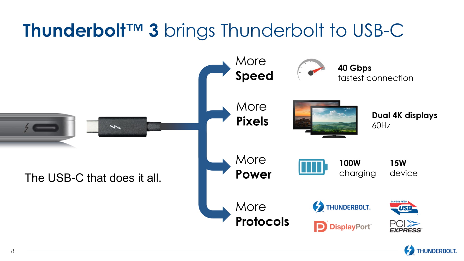 En lugar de utilizar el conector Mini DisplayPort, que Thunderbolt ha utilizado desde que se introdujo por primera vez, Thunderbolt 3 se está moviendo a un conector de tipo C USB, que Apple presentó con su nueva MacBook. Como resultado, es probable que veamos USB Tipo-C hacer su camino a toda la gama MacBook lo largo de los próximos años.