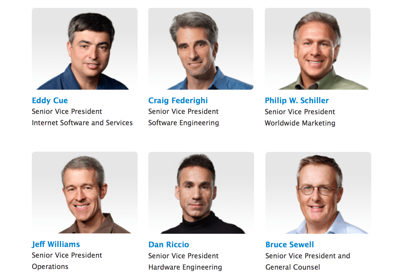 Apple Senior Vice Presidentes Eddy Cue, Craig Federighi, Dan Riccio, Phil Schiller, Bruce Sewell, y Jeffrey Williams, todos recibieron premios iguales de bonificación.