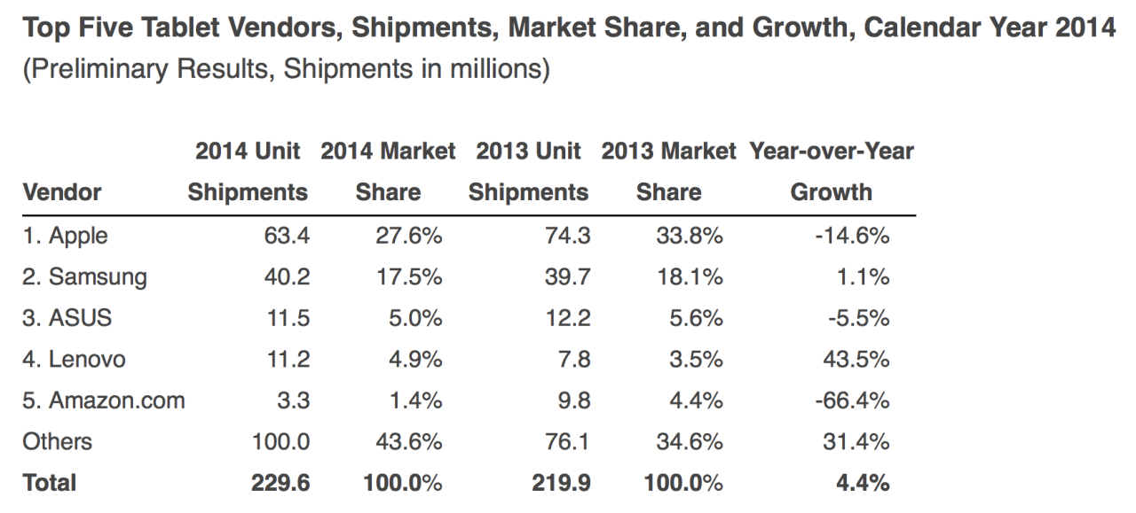 IDC señala que el liderazgo de Apple con respecto a otros proveedores aún no se ha cuestionado, ya que verdaderamente enviado 21,4 millones de tabletas, lo que representa más de una cuarta parte del mercado con un 28,1% de cuota de volumen. A pesar de los problemas de Samsung, se las arregló para mantenerse en el segundo lugar con 11 millones de unidades vendidas. Lenovo (4,8%), ASUS (4%) y Amazonas (2,3%) completaron el top 5, aunque sólo Lenovo logró crecer anualmente en comparación con el 4T de 2013. Lenovo mantuvo su férreo control sobre el mercado gracias Asia / Pacífico a su escala masiva en el negocio de PC y el éxito de su oferta de tabletas de bajo costo.